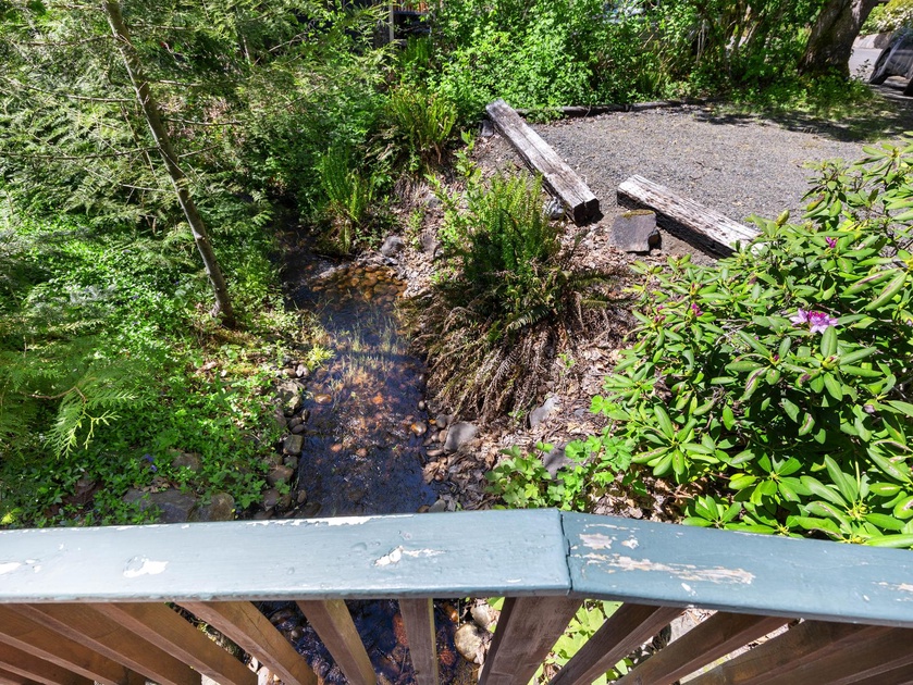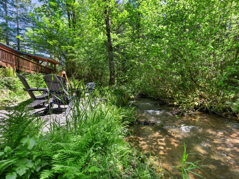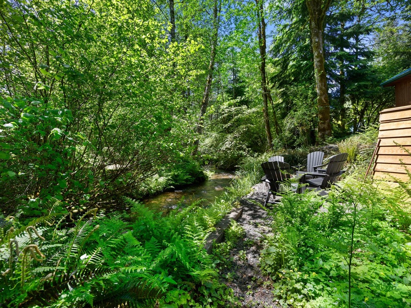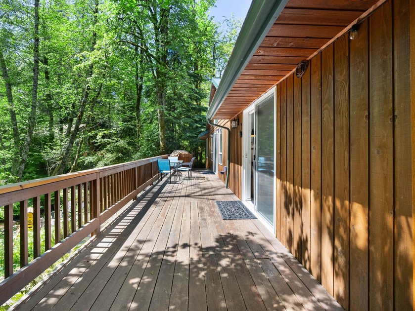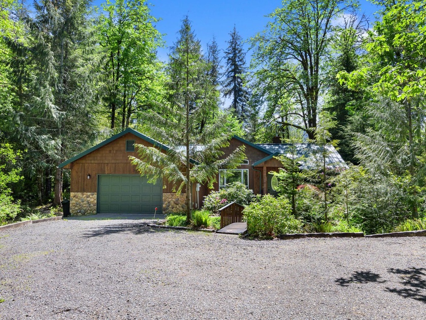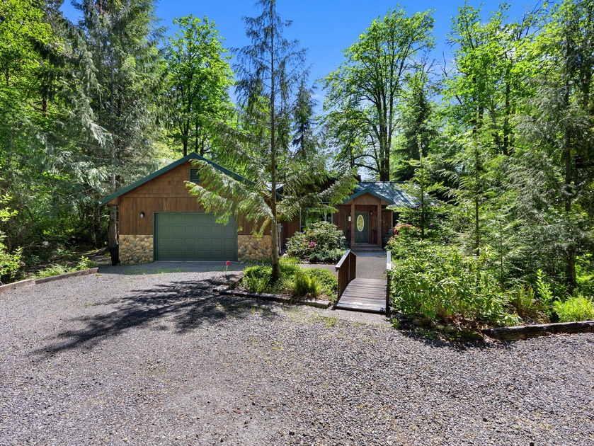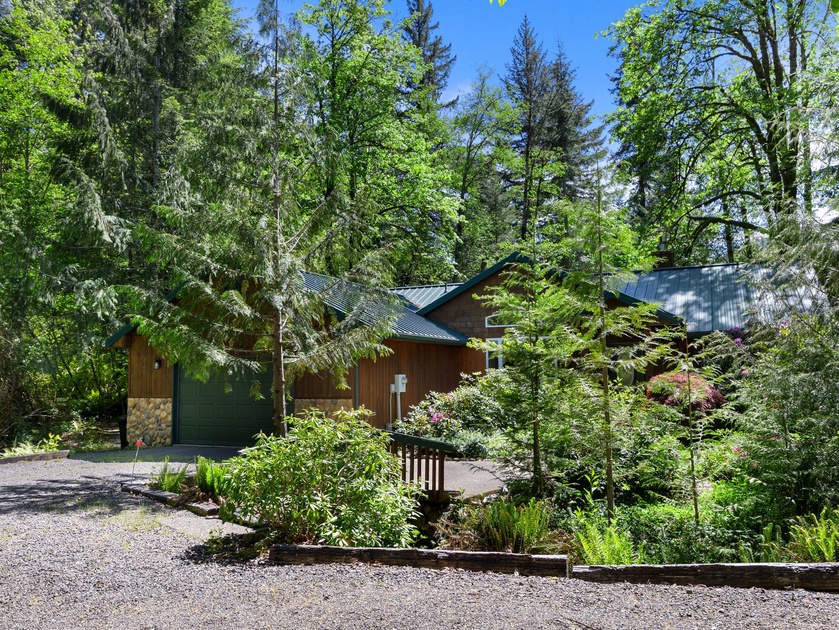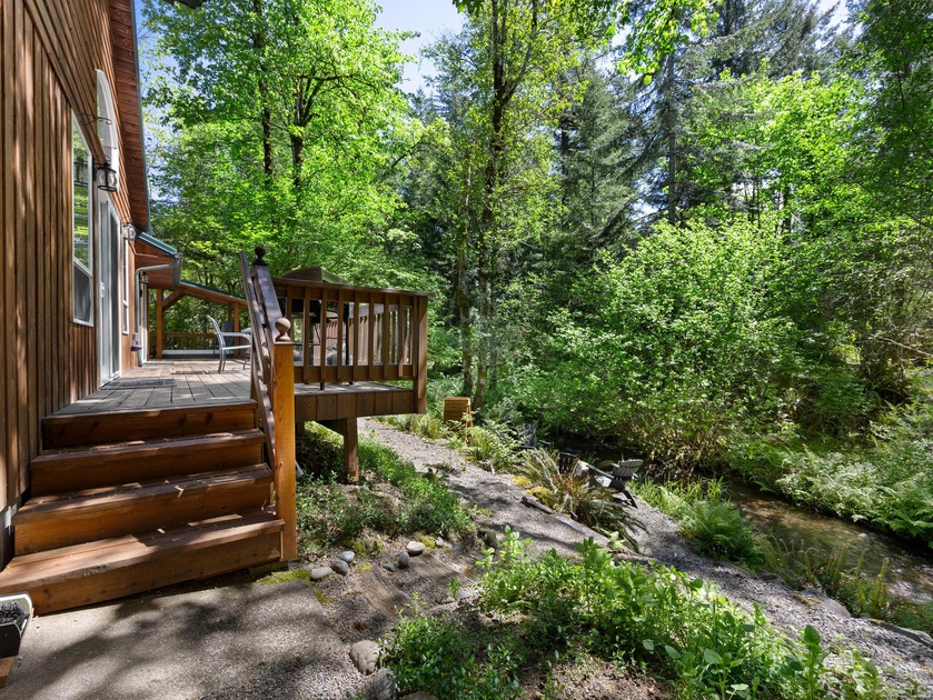 Located in Rhododendron, this home quietly sits at the end of a quiet cul-de-sac surrounded by two creeks. Just as you enter the home you will cross a footbridge over a seasonal creek. You’ll step into the light filled great room with a warm and inviting rock fireplace. The back deck over looks Hackett Creek and the wood burning creek side fire pit.