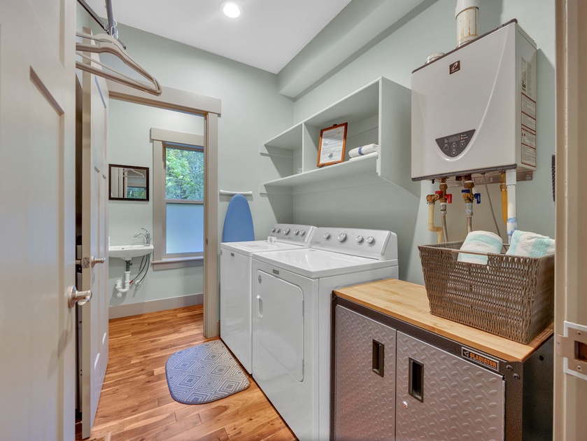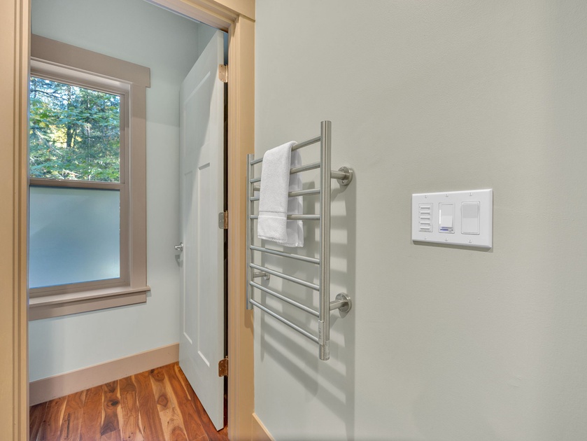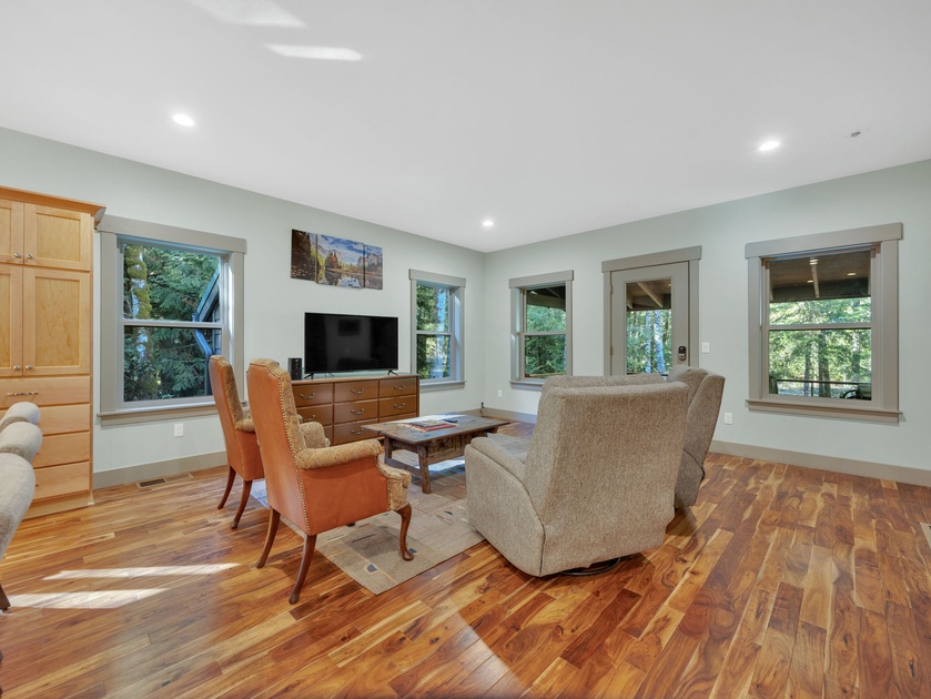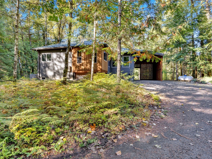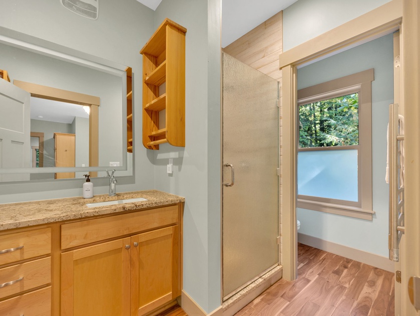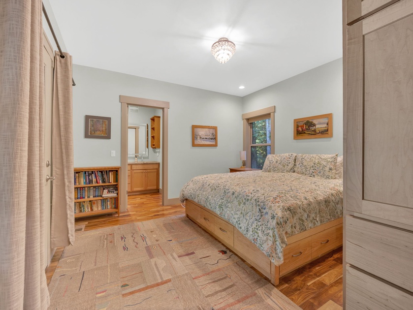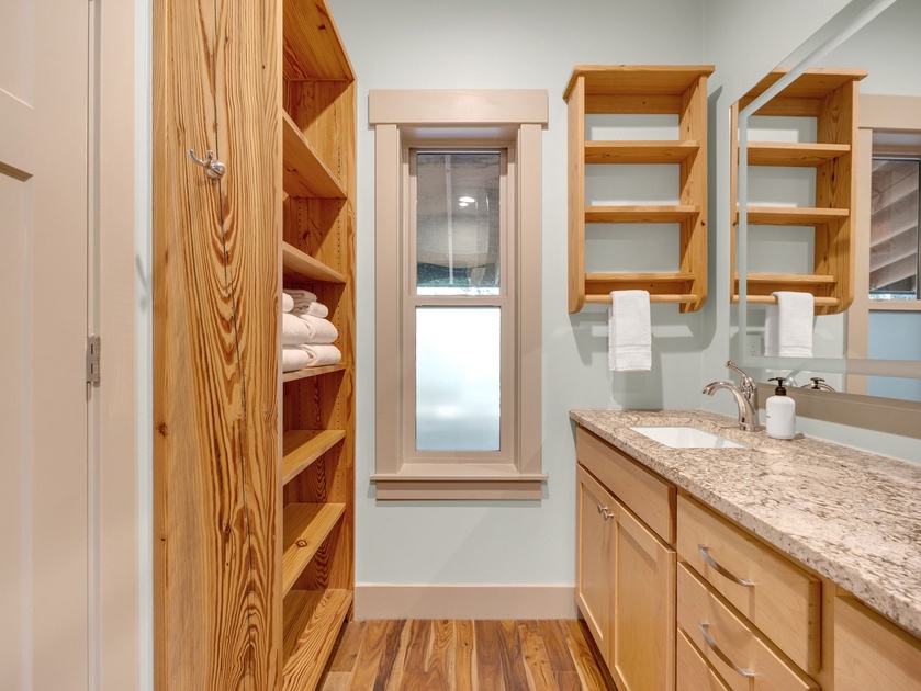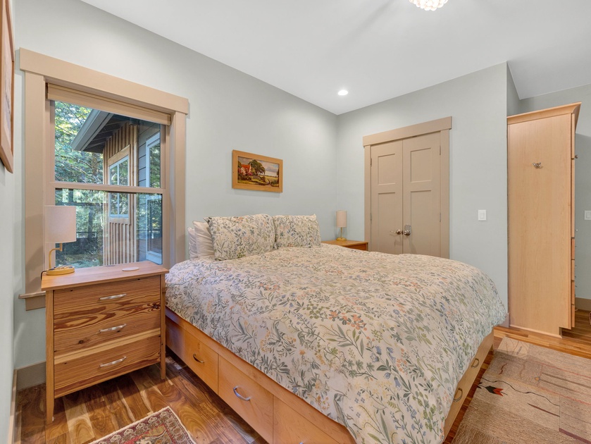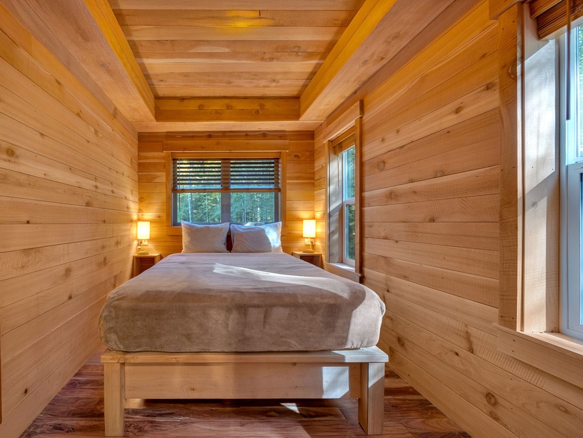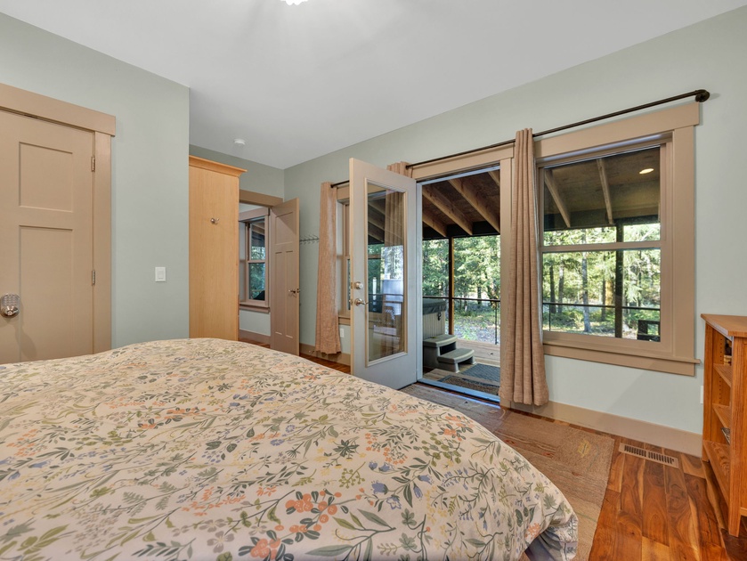 Leilani Cottage is best suited for a romantic retreat to Mt Hood with the primary suite including the king bed topped with a 2-inch thick faux-feather bed and the en-suite bathroom with tiled walk-in shower and rain shower head.