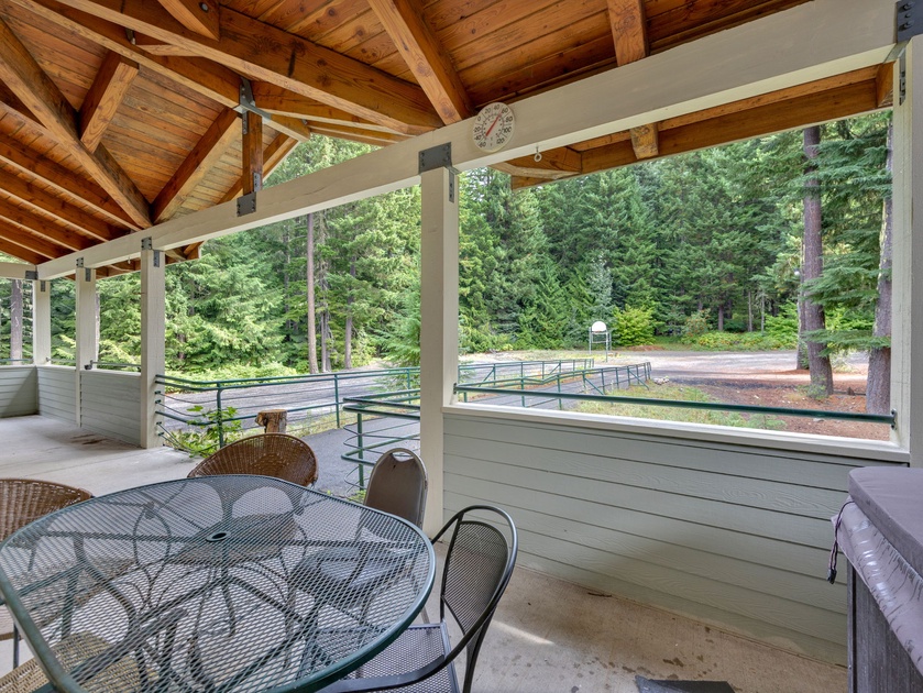 During summer months, enjoy a full-sized soccer field and basketball court. Near the field, there is a shared firepit for roasting marshmallows and warming your hands during the evenings. The private hot tub is located off of the side deck and you’ll feel like you are amongst the trees.