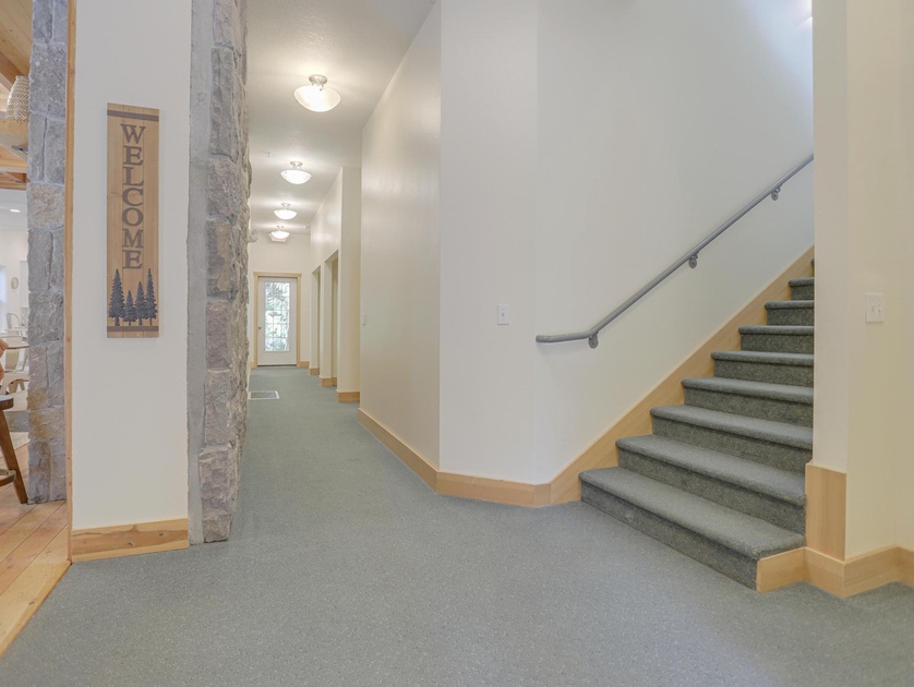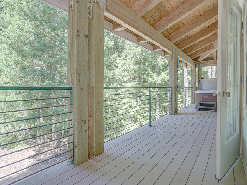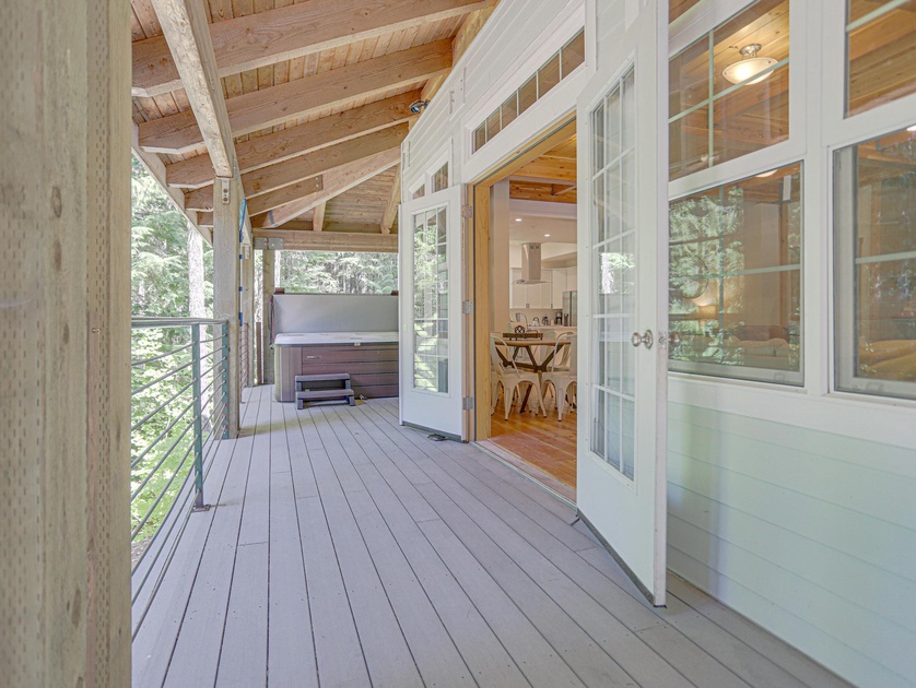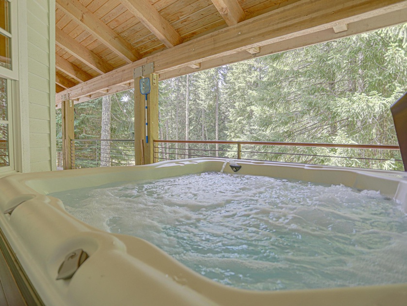 During summer months, enjoy a full-sized soccer field and basketball court. Near the field, there is a shared firepit for roasting marshmallows and warming your hands during the evenings. The private hot tub is located off of the side deck and you’ll feel like you are amongst the trees.