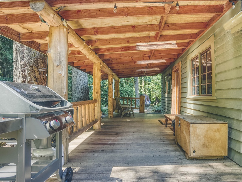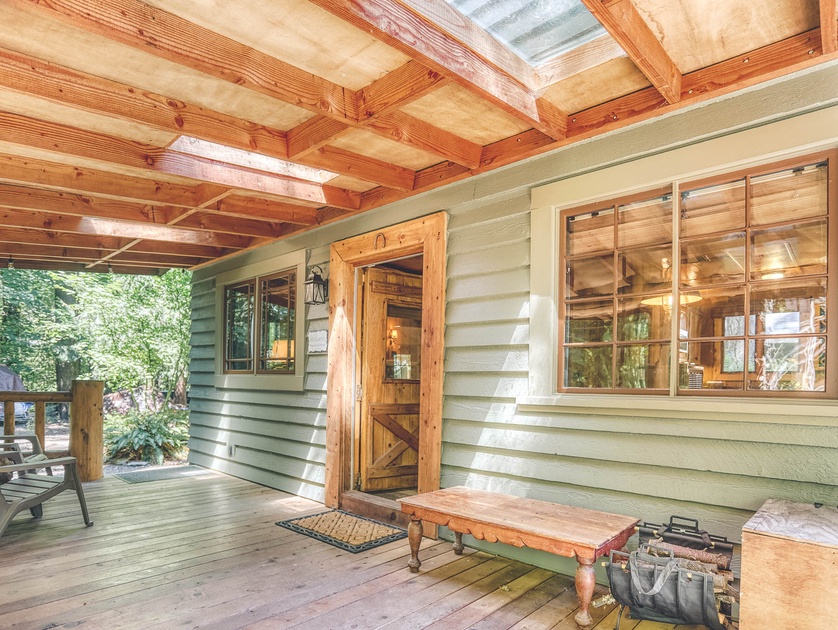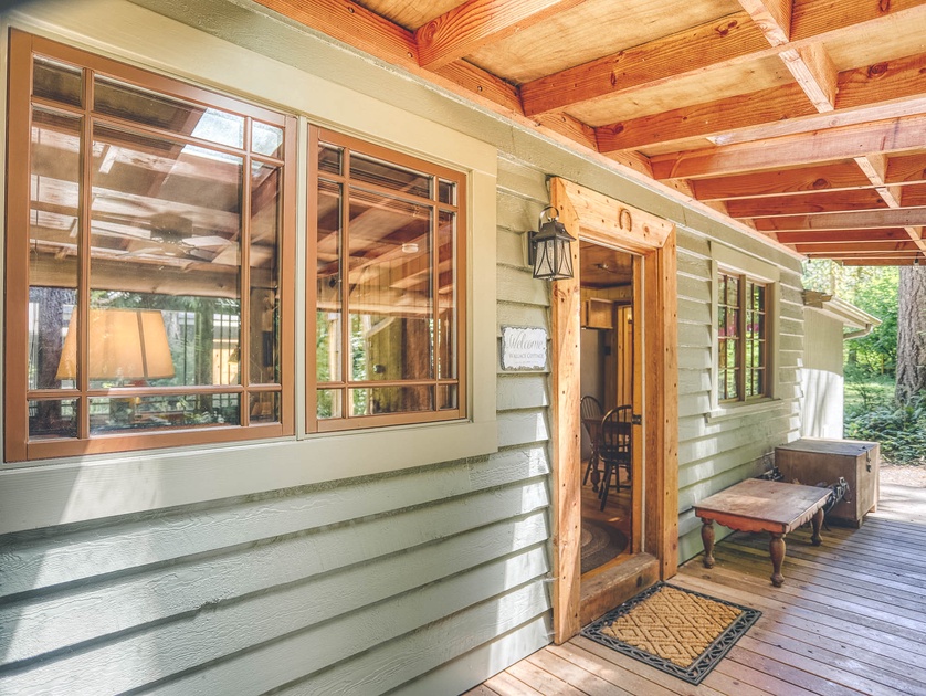 Grill on the gas BBQ year-round under the covered front porch. Listen to the soothing water feature and pond in the front yard, while you dine alfresco at the outdoor dining table. Kids will have fun in the play structure and running around the large lawn in the backyard. You can warm up around the 3-season firepit, too. The Wallace Cottage is close to Wildwood Recreation Site, Sandy Ridge Mountain Bike Trails and Mt Hood National Forest hiking trails. The Wallace Cottage is next door to the Bridlewood Cabin for 2 families or couples traveling together.