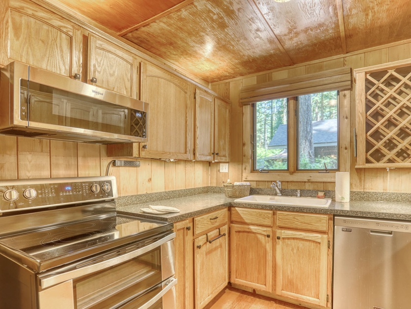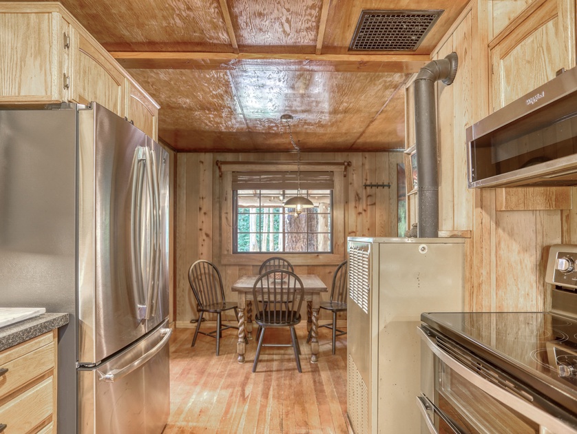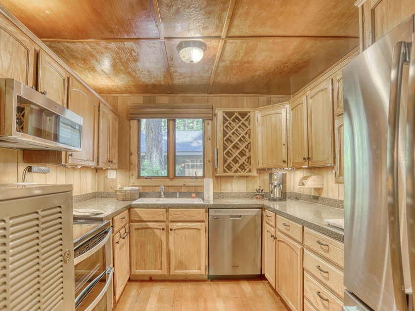 A beautifully restored 1939 vintage cabin will take you back in time to the early days of vacation retreats at Mt Hood. Get comfortable in the cozy and warm living room by the original rock fireplace with a woodstove insert. Cook meals in the modern and updated kitchen with new stainless appliances. You will love the big yard for summer fun with a sunny lawn and a shaded covered porch surrounded by tall old-growth Douglas fir trees.