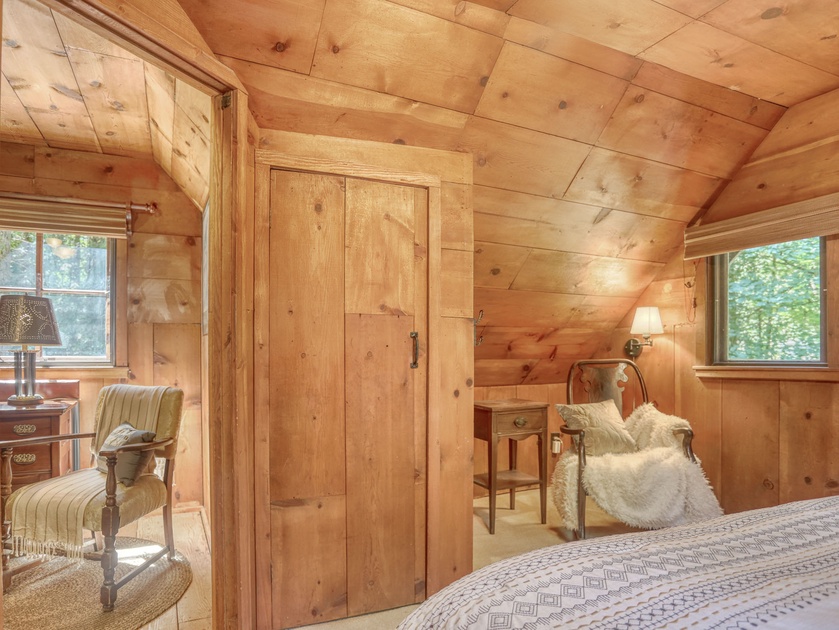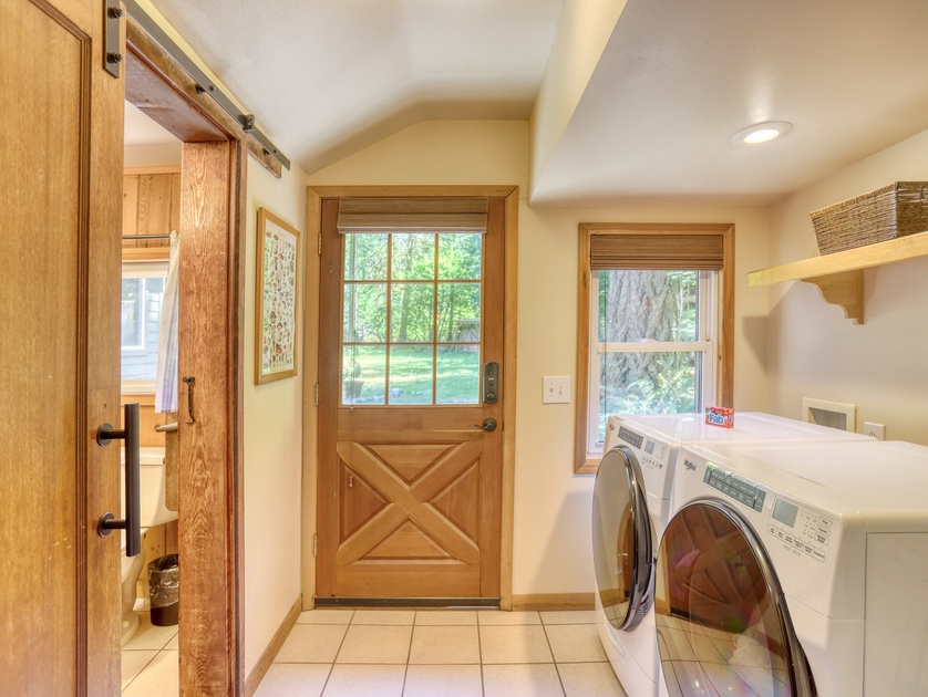 The two bedrooms are upstairs with a queen bed in one and a double bed in the second bedroom. Recline with a good book in the reading nook at the top of the stairs in-between the two bedrooms. The bathroom downstairs is fully remodeled with a tub/shower enclosure, modern vanity and warm views of the backyard. The updated mudroom includes full-sized front-loading washer and dryer.
